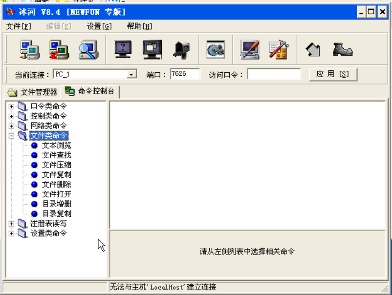 该类命令中,“文件浏览”、“文件查找”、“文件压缩”、“文件删除”、“文件打开”等菜单可以查看、查找、压缩、删除、打开远程主机上某个文件。“目录增删”、“目录复制”、可以增加、删除、复制远程主机上的某个目录。