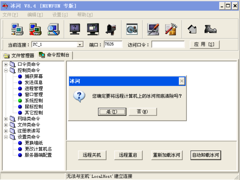 点击“控制类命令”前面的“+”,点击“系统控制”可看到“自动卸载冰河”按钮并点击,在弹出的窗口里面点击“是”,则可以卸载远程主机上的木马如图14自动卸载冰河木马。