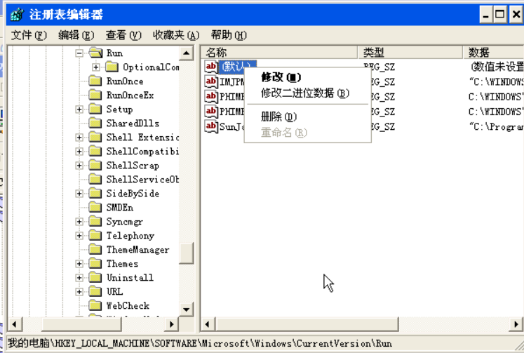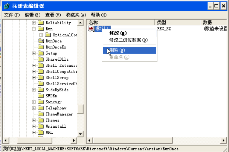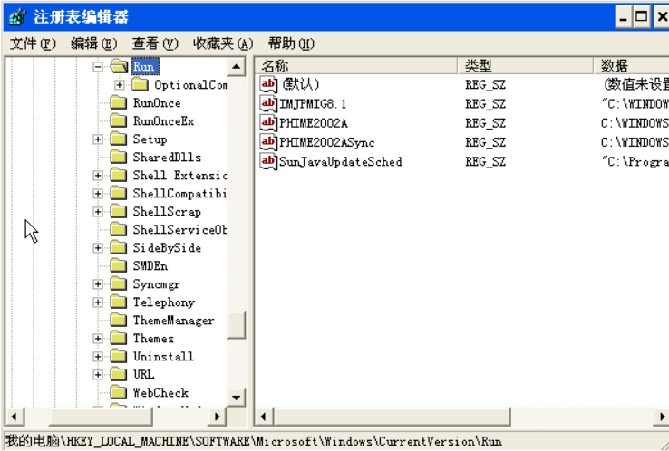 上面两个注册表的子键目录Run和Runservices中存放的键值是系统启动时自动启动的程序,一般病毒程序,木马程序,后门程序等都放在这些子键目录下,所以要经常检查这些子键目录下的程序,如果有不明程序,要着重进行分析。