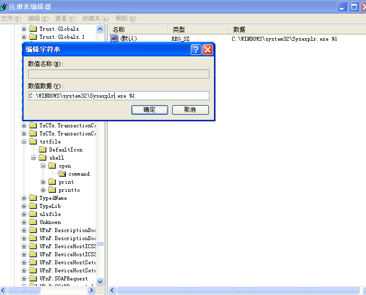 方法是找到注册表的HKEY_CLASSES_ROOT\txtfile\Shell\open\command下的默认值,选中“(默认)”,单击鼠标右键,选择修改如图18编辑字符串。