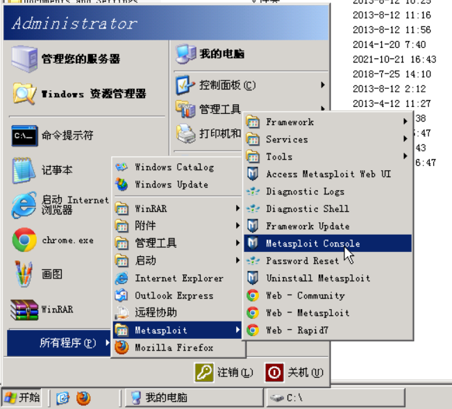 1:登录到自己分配到的攻击机上,在"开始"-->"程序"中查看是否安装了Metasploit工具,C盘里是否有“2013最新免杀远程”压缩包,系统是否有CMD命令行工具。