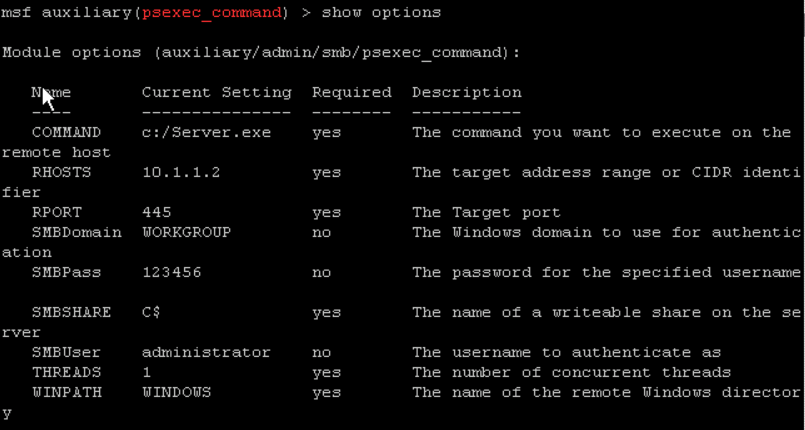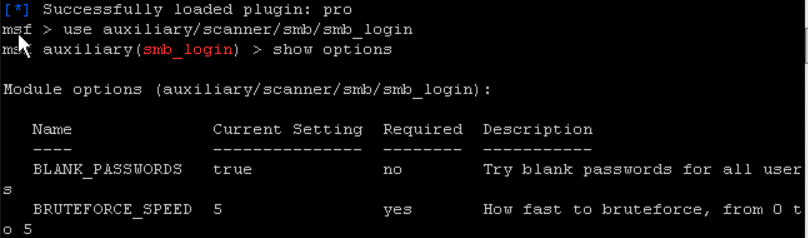 在msf提示符下输入use auxiliary/scanner/smb/smb_login,以加载利用模块。输入show options查看设置选项,如下图: