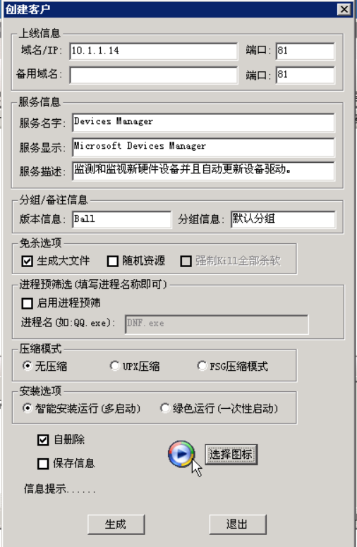 域名/IP:填写木马安装后向木马监控者发出信息的指定IP,一般为攻击者的IP,但是必须要受害者访问得到;
