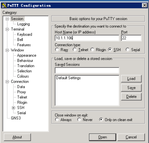 登录实验机后,打开桌面上的putty程序,输入10.1.1.106,再点击Open.。
