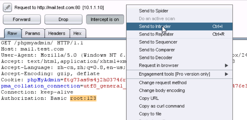 5、接下来对phpmyadmin进行暴力破解,随便输入一个用户名和密码,比如此处我输入:用户名:root 密码:123,页面提示错误,然后查看burpsuite截获到的数据包。