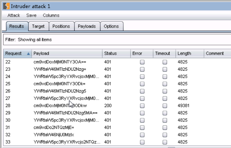 14、单击intruder下的start attack,一段时间后,发现了一个length和其他的不同。