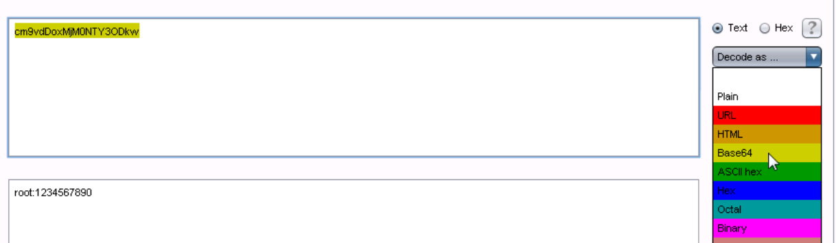 16、粘贴在decoder下,选择decode as base64,可以看到用户名密码为root:1234567890,登录。