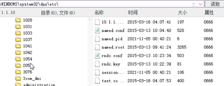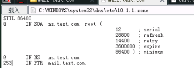 21、接下来我们需要对这台服务器进行域名劫持,将其劫持到一台IP为10.1.1.253的主机上,找到C:\WINDOWS\system32\dns\etc中的test.com.zone和10.1.1.zone。