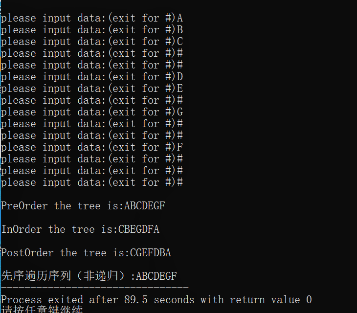2.在上题中补充求二叉树中求结点总数算法(提示:可在某种遍历过程中统计遍历的结点数),并在主函数中补充相应的调用验证正确性。