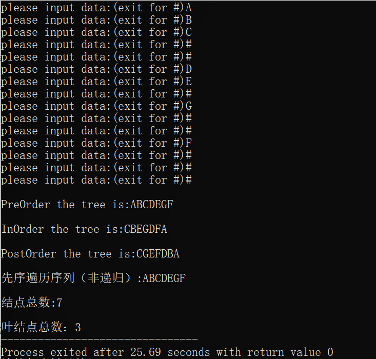 3.在上题中补充求二叉树中求叶子结点总数算法(提示:可在某种遍历过程中统计遍历的叶子结点数),并在主函数中补充相应的调用验证正确性。