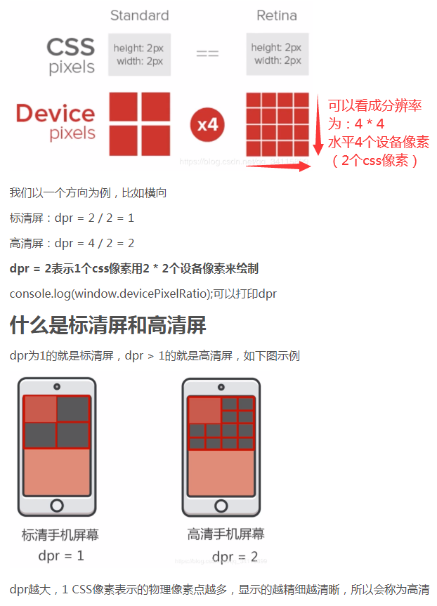 设备像素比(dpr):指在移动开发中1个CSS像素占用多少设备像素,如dpr为2时,代表1个css像素用2*2个设备像素来绘制(这里不要觉得是水平1css像素等于 4 设备像素,其实是 1 * 1css像素 = 2 * 2设备像素,也就是水平的1css像素等于2个设备像素)。公式为 1px = (dpr) 2 * 1dp(这里指的是整一个水平和垂直的表示了)。