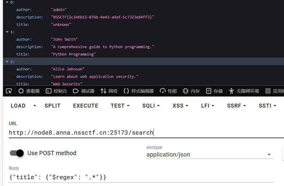 回到题目,逻辑很简单,接收 JSON 字符串,取出 title 键的值,如果值类型为字典则不执行 sanitize() 正则替换操作,直接添加进 query 变量 $and 键值