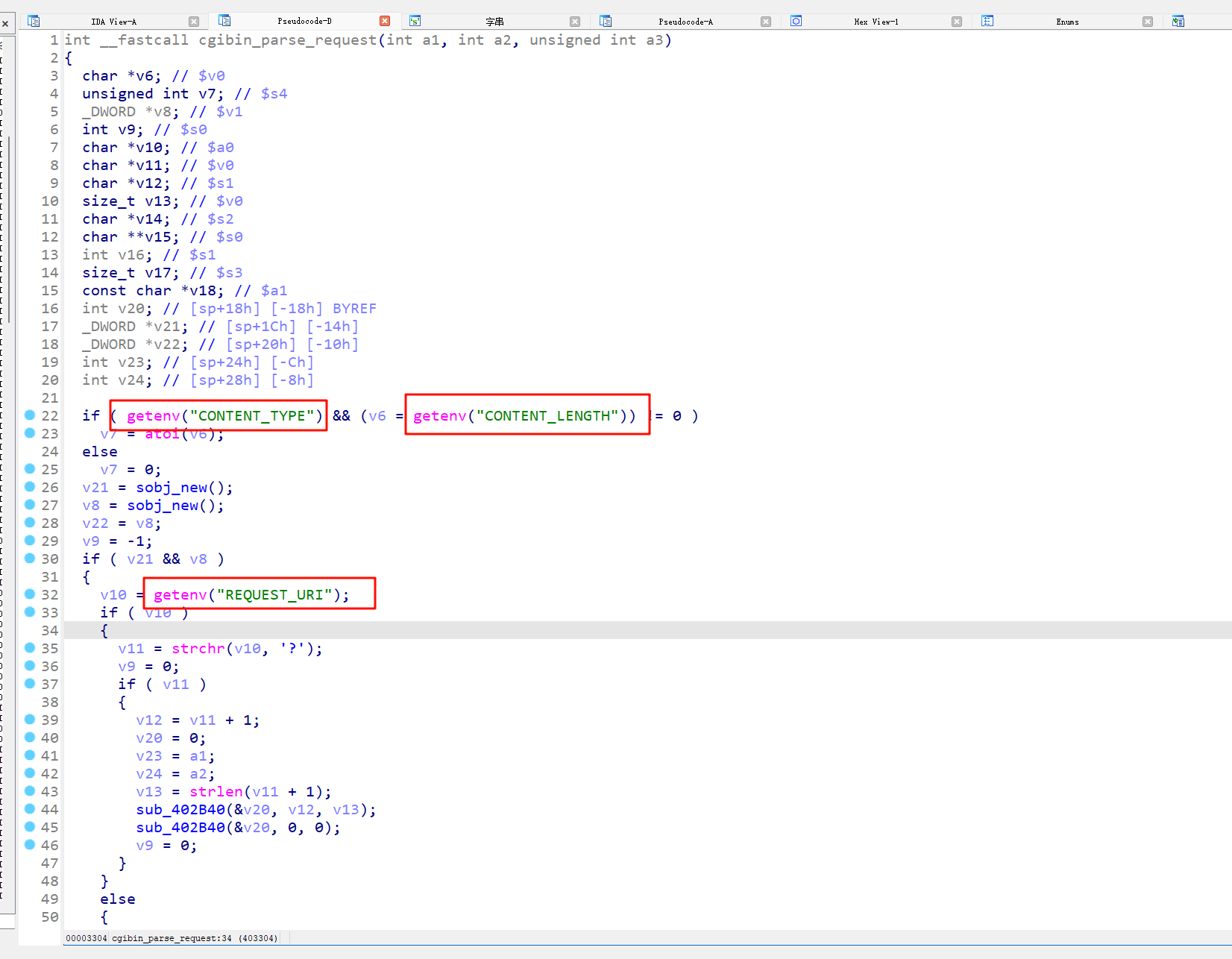经过前面代码审计可知,要达到溢出,需要从cookie中读取CONTENT_TYPE和CONTENT_LENGTH和REQUEST_URI三项,不过和后面的栈溢出漏洞关系都不大,但是不能没有,需要随便输入一点东西