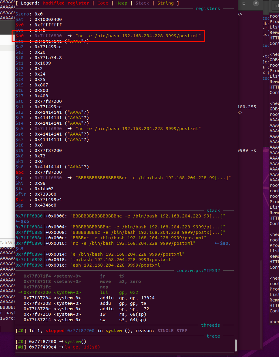 将栈$sp+16的地址保存到s5寄存器上,然后再将s5赋值到a0上,也就是第一个参数,就是吧反弹shell的语句赋值上去,再jmp到原本保存在s0上的system
