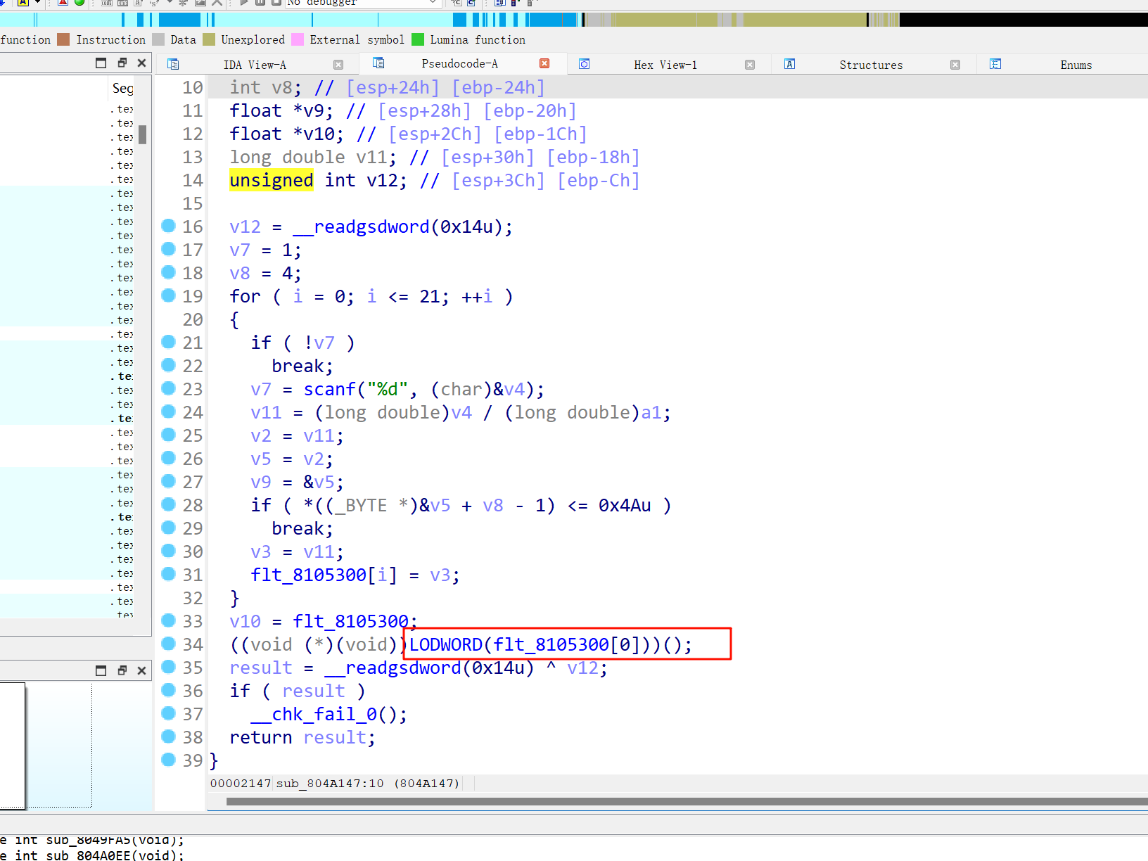 1、我们输入的int数值会被当做long double进行除法操作,最后除完会强转为float类型,我们只需要提前按照要求乘回来,可以就可以构造写入我们的shellcode了,但是第三个位置得大于0x4a,挺多都被限制住了