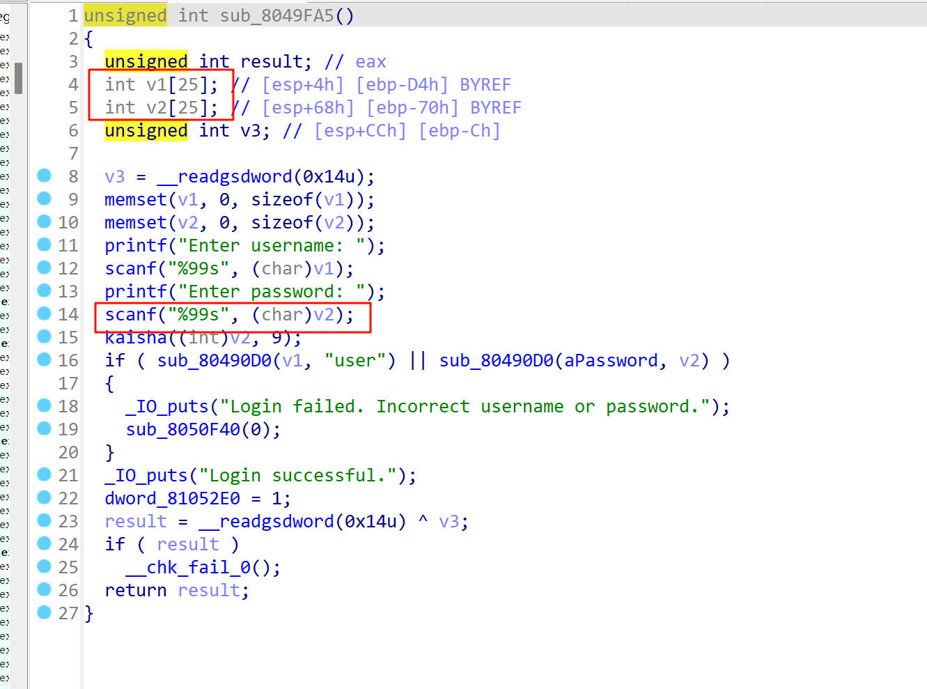 我也观察到在login函数中有有一个栈溢出,但是没用,其实被下面的限制住了,但是我们是否可以不断pop,知道回到栈上我们可控的位置,我们可以在这里使用其他功能点提前布置内容,经过不断pop就可以到这个位置执行别的内容
