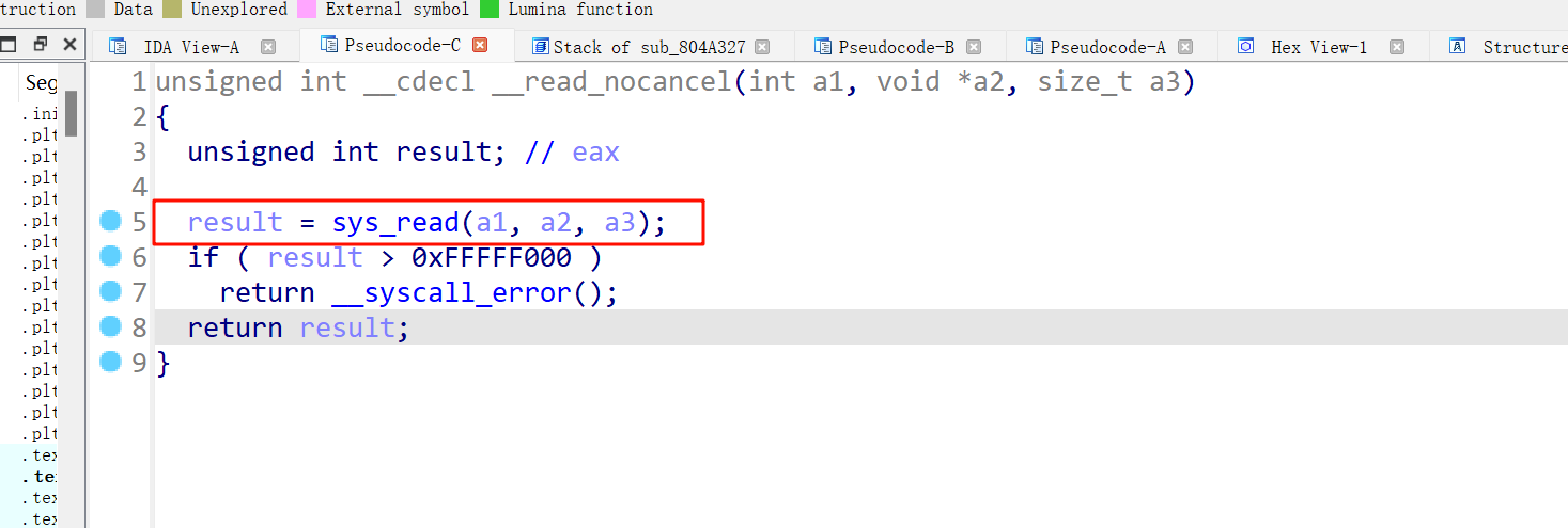 整个函数看到了sys_read函数,具体思路就是劫持到这里,然后在此处写shellcode