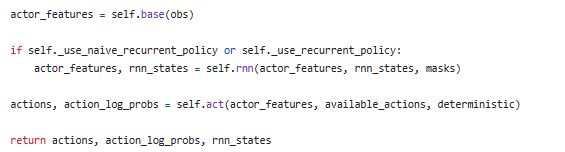 代码较简单,不多加赘述,返回动作与rnn状态(如果使用rnn)