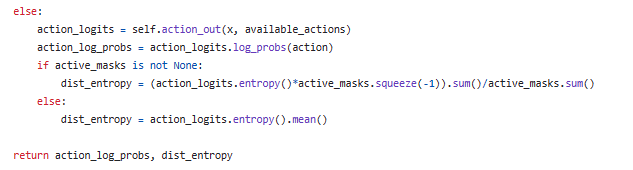 然后,根据是否使用策略激活掩码,计算了策略动作损失 policy_action_loss。如果使用策略激活掩码,则将损失乘以 active_masks_batch,并对其进行求和并归一化。否则,直接对损失进行求和并取平均。