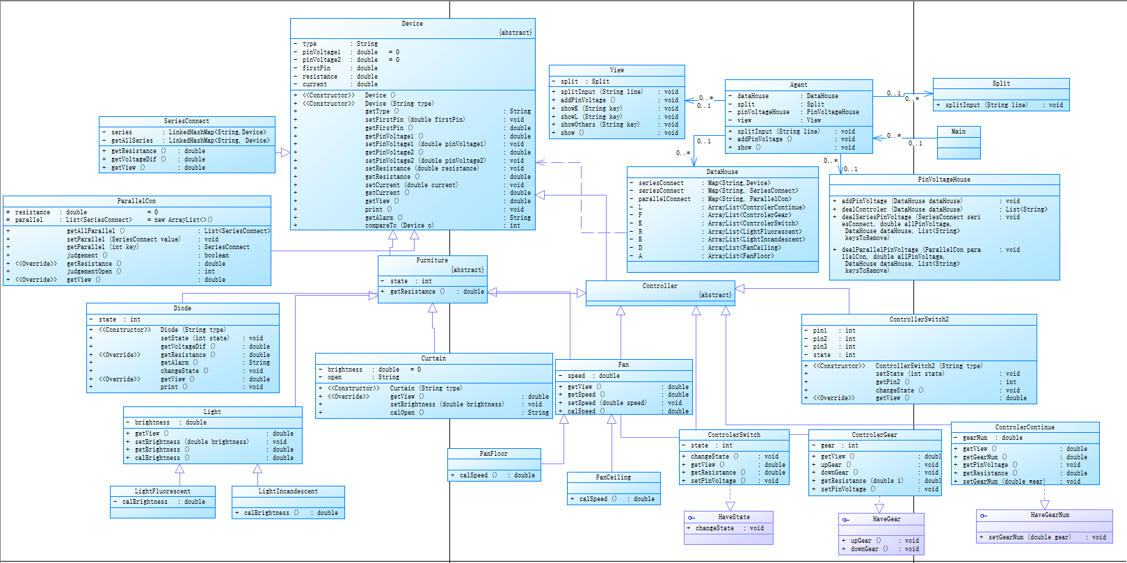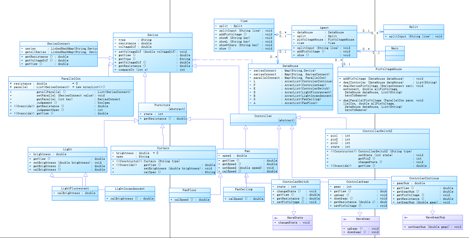 总体设计还是比较合理的,抽象出父类Furnture和Controller,Furniture的子类中又抽象出Fan和Light,再向下分出子类各个家具,Controller分出三种控制设备的子类,并根据控制电压的不同方式分别连接三个不同的接口。输入的信息先由Split进行分割,再由PinVoltageHouse对所有电器分配电压,最后由View进行输出。