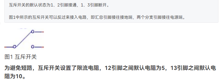 为避免短路,互斥开关设置了限流电阻,12引脚之间默认电阻为5,13引脚之间默认电阻为10。