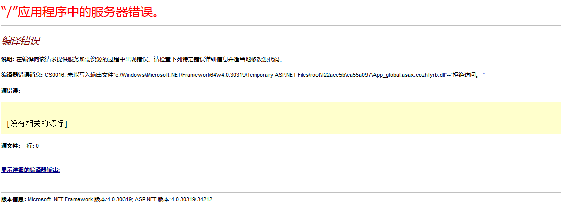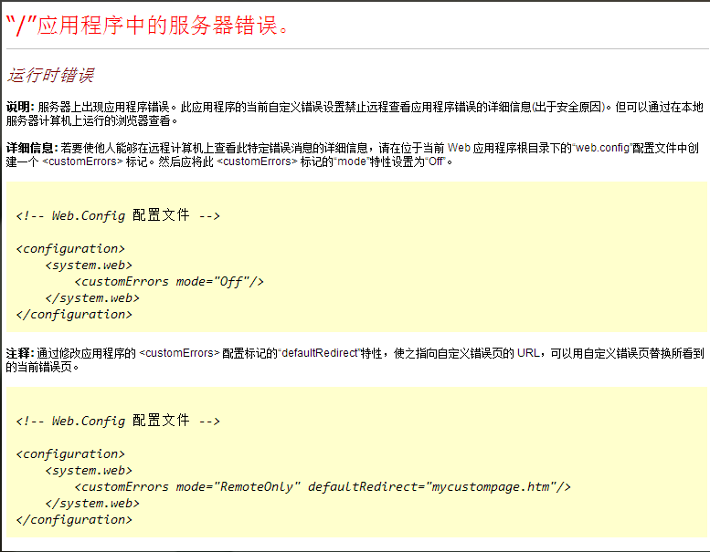 详细信息: 若要使他人能够在远程计算机上查看此特定错误消息的详细信息,请在位于当前 Web 应用程序根目录下的“web.config”配置文件中创建一个 <customErrors> 标记。然后应将此 <customErrors> 标记的“mode”属性设置为“Off”。