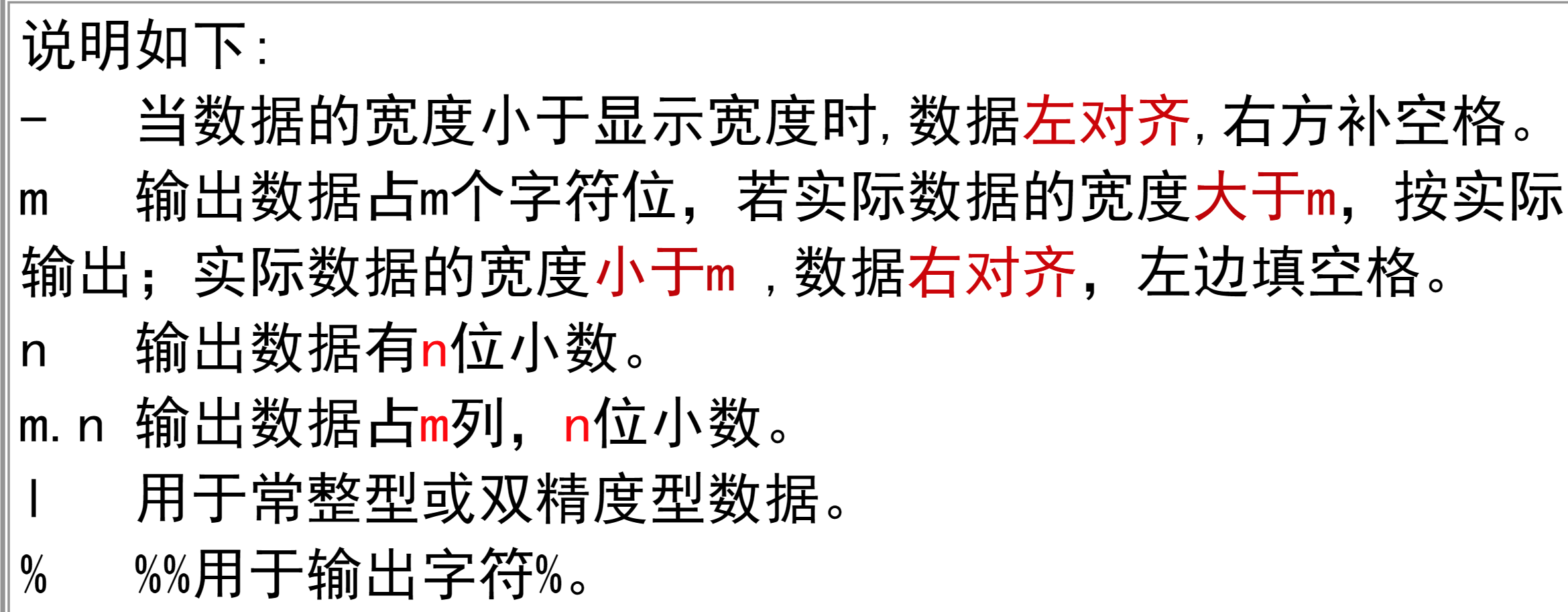 一般形式:%[-] [m] [.] [n] [l]