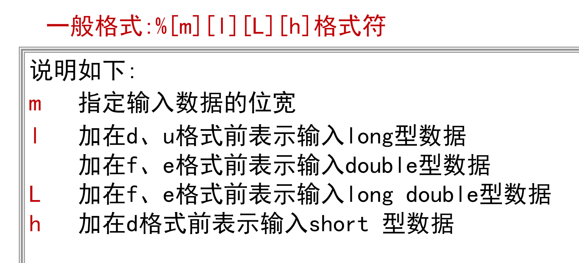 (1)格式控制符串由双引号括起来,由“%”和格式符以及普通字符组成。