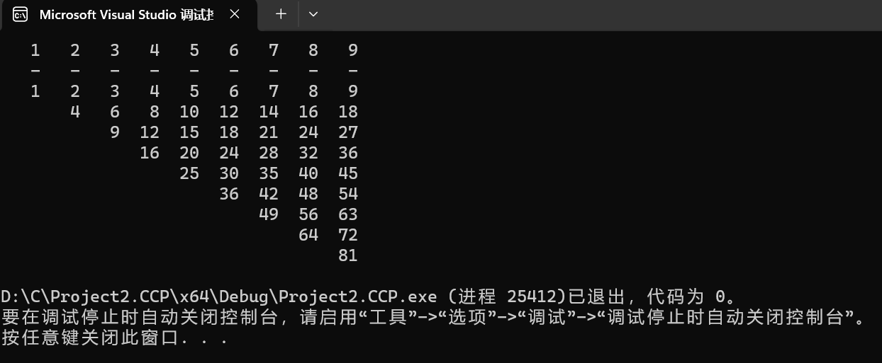 #include<stdio.h> int main() { int i, j; for (i = 1; i <= 9; i++) { printf("%4d", i); } printf("\n"); for (i = 1; i <= 9; i++) { printf("%4c", '-'); } printf("\n"); for (i = 1; i <= 9; i++) { for (j = 1; j <= 9; j++) { if (i > j) { printf(" "); } else { printf("%4d", i * j); } } printf("\n"); } return 0; }