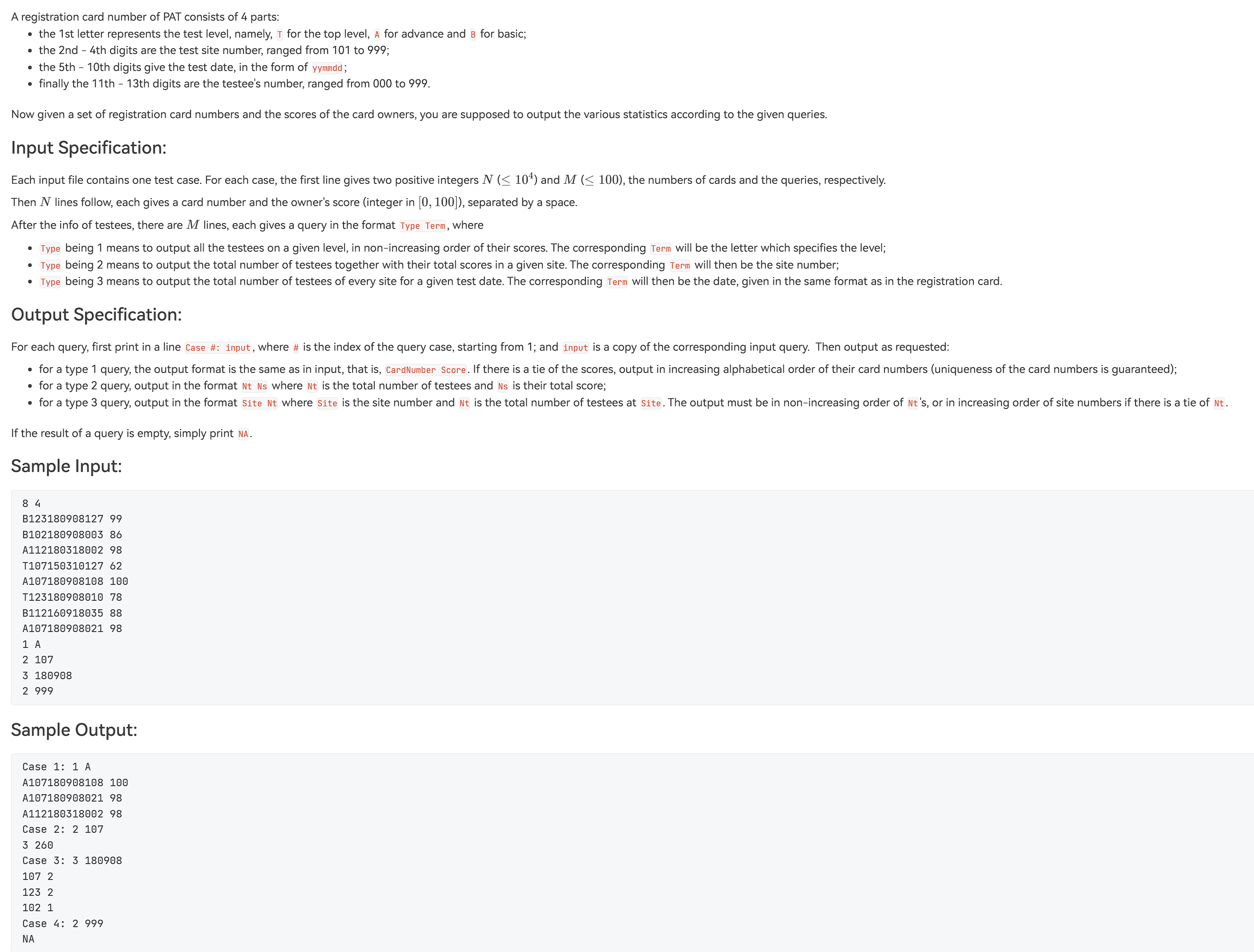 for(auto& p : res) printf("%s %d\n", p.first.c_str(), p.second);