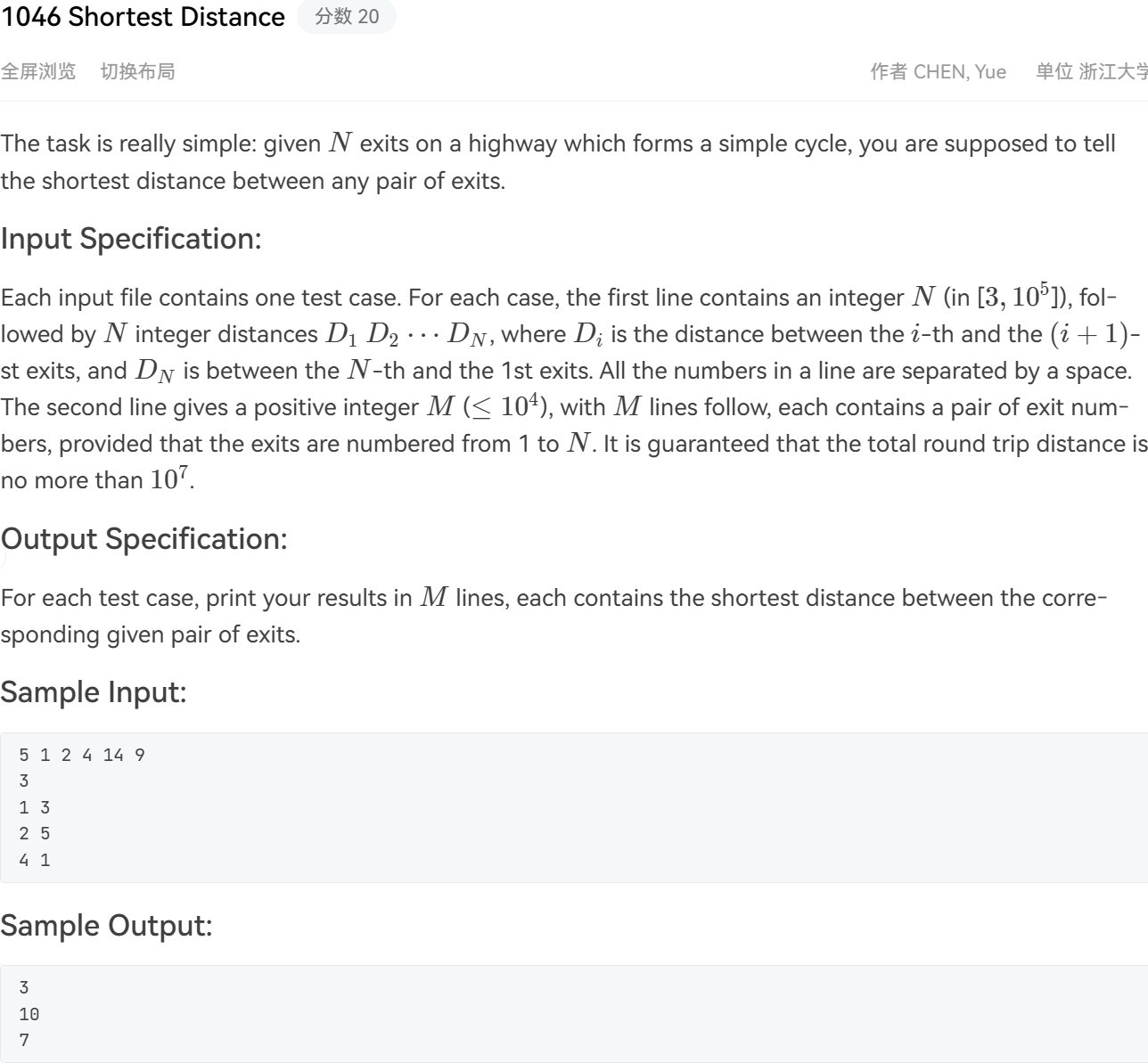 PAT甲级——1046 Shortest Distance——分数 20
