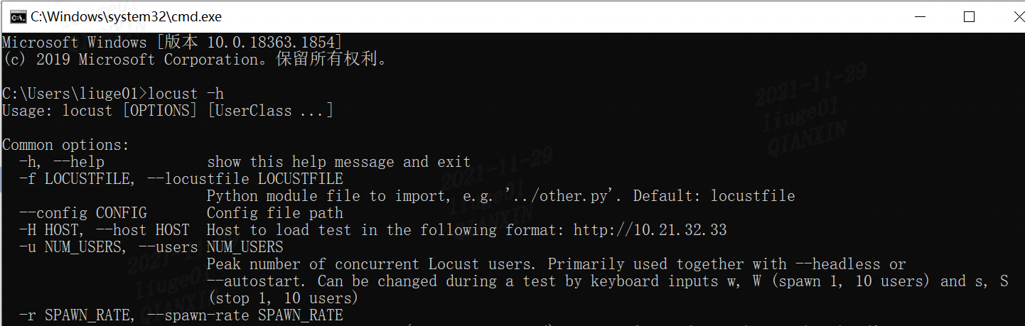 3. 验证安装是否成功。使用命令:locust -h [查看版本: locust -V]