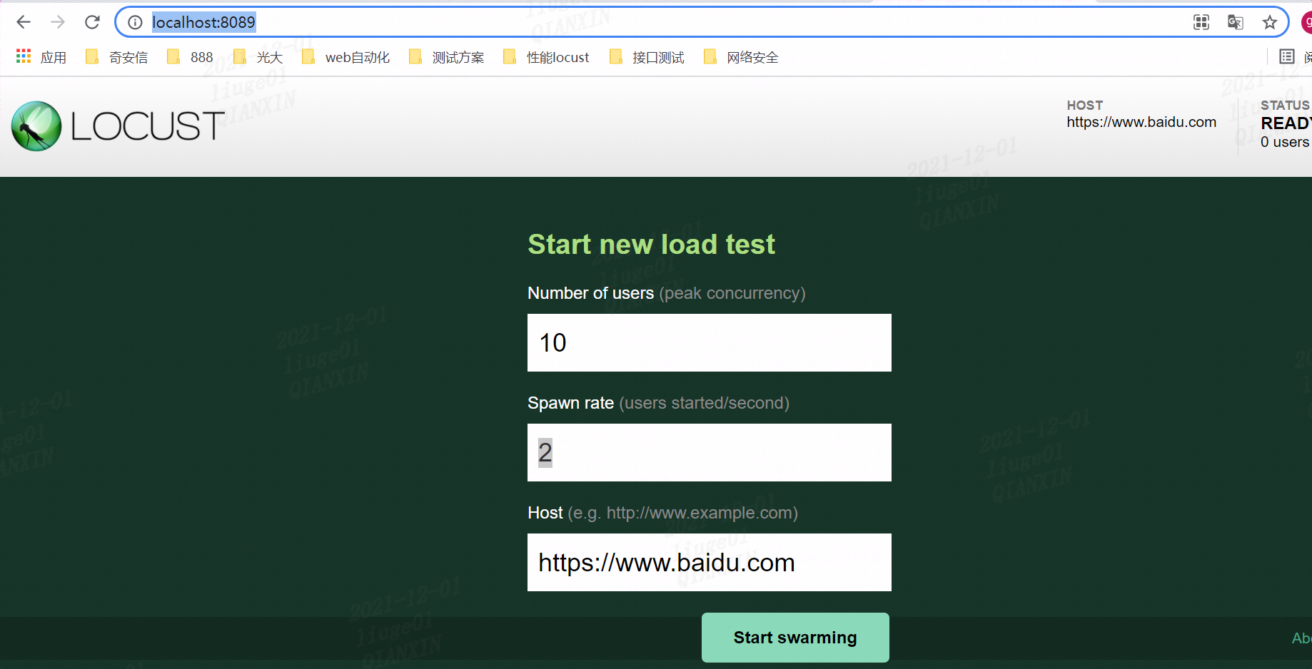 2.6 通过 http://localhost:8089/ 访问,Number of total users to simulate设置模拟的用户数,Spawn rate (users spawned/second)每秒启动的虚拟用户数