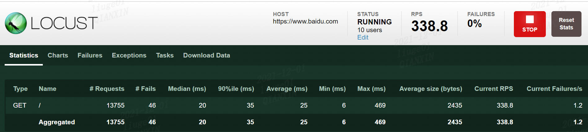 from locust import HttpUser, TaskSet, task import urllib3 urllib3.disable_warnings() class UserBehavior(TaskSet): def on_start(self): print("start****") def on_stop(self): print("stop****") @task(1) def baidu_page1(self): res = self.client.get("/") class WebsiteUser(HttpUser): tasks = [UserBehavior] host = "https://www.baidu.com" min_wait = 1000 max_wait = 2000 if __name__ == '__main__': import os os.system("locust -f test.py --host=https://www.baidu.com")