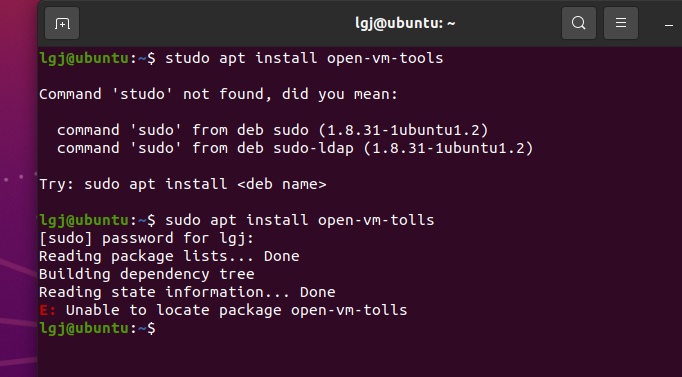 在这里运行了一个sudo apt install open-vm-tools命令(安装基本软件包,需要输入管理员密码);不知道为什么直接打不开。