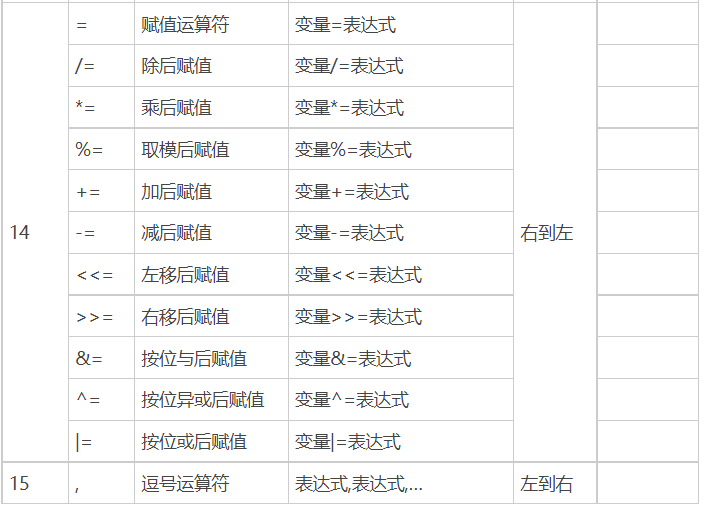 - 所有双目运算符中只有赋值运算符的结合方向是从右往左。