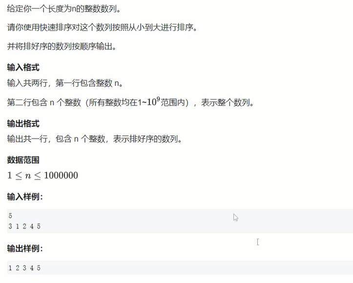 #include<bits/stdc++.h> using namespace std; const int N = 1e6+10; int n; int q[N]; void quick_sort(int q[],int l,int r) { if(l>=r) return ; int x= q[l],i=l,j=r; while(i<j) { while(i<j&&q[j]>=x) //这里前面定义了x为q[i],故要从后面遍历,让后面的数值覆盖前面的q[i] { j--; } q[i]=q[j]; while(i<j&&q[i]<=x) { i++; } q[j]=q[i]; } q[i]=x; //这里不要忘记将开始的分界点放回数组中 quick_sort(q,l,i); quick_sort(q,j+1,r); } int main() { scanf("%d",&n); for(int i =0;i<n;i++) { scanf("%d",&q[i]); } quick_sort(q,0,n-1); for(int i = 0; i<n;i++) { printf("%d",q[i]); } }