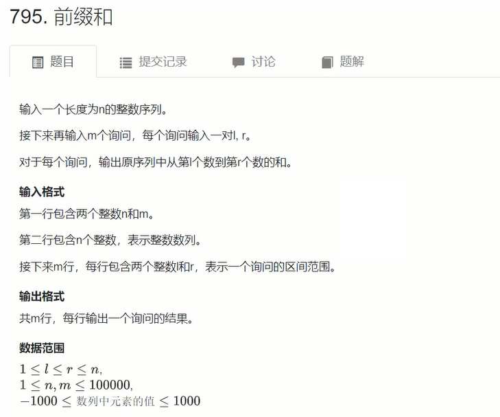 int n,m; const int N=1e6+10; int a[N],s[N]; int main() { cin>>n>>m; /** 在处理前缀和时下标一般选为 1 — n,因为每次都是用 S[j] - S[i -1] 为了代码中格式统一,即使S[n]就是前n项的前缀和,我们仍然使用 S[ n ] - S[ 0 ] 这样为了不越界,就将范围定为 1 — n,将S[0] 定为 0 **/ for(int i=1;i<=n;i++) { scanf("%d",&a[i]); s[i] = s[i-1] + a[i]; } while(m--) { int l ,r; cin>>l>>r; cout<< s[r] - s[l-1]<<endl; } }