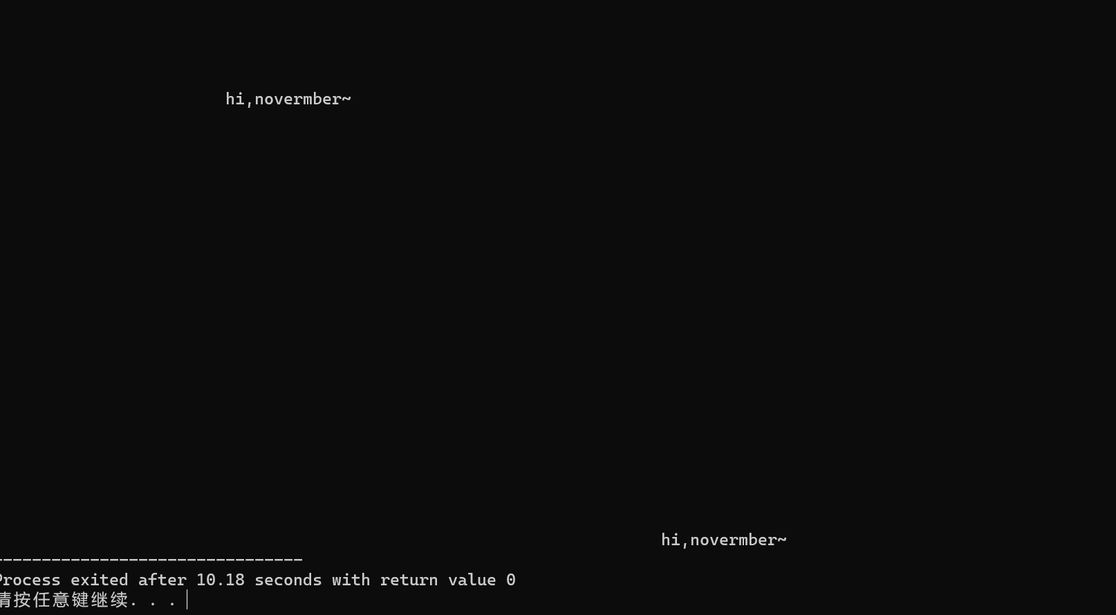 #include <stdio.h> #include <stdlib.h> #include <time.h> #include <windows.h> #define N 80 void print_text(int line,int col,char text[]); void print_speace(int n); void print_blank_lines(int n); int main(){ int line,col,i; char text[N]="hi,novermber~"; srand(time(0)); for(i=1;i<=10;++i) { line=rand()%25; col=rand()%80; print_text(line,col,text); Sleep(1000); } return 0; } void print_speaces(int n) { int i; for(i=1;i<=n;++i) printf(" "); } void print_blank_lines(int n){ int i; for(i=1;i<=n;++i) printf("\n"); } void print_text(int line,int col,char text[]){ print_blank_lines(line-1); print_speaces(col-1); printf("%s",text); }