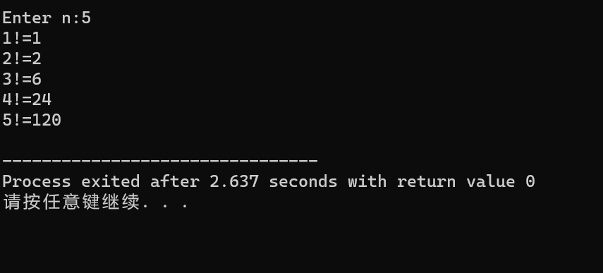 #include <stdio.h> long long fac(int n); int main(){ int i,n; printf("Enter n:"); scanf("%d",&n); for (i=1;i<=n;++i) printf("%d!=%lld\n",i,fac(i)); return 0; } long long fac(int n){ static long long p=1; printf("p=%lld\n",p); p=p*n; return p; }