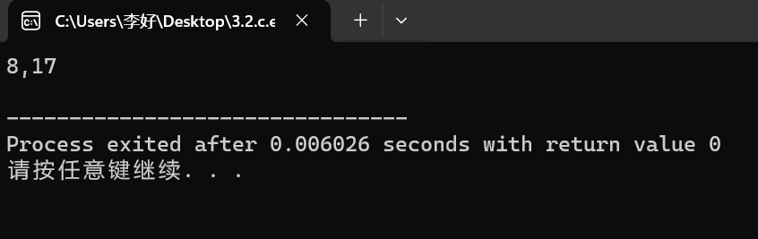 #include <stdio.h> int func(int,int); int main(){ int k=4,m=1,p1,p2; p1=func(k,m); p2=func(k,m); printf("%d,%d\n",p1,p2); return 0; } int func(int a,int b){ static int m=0,i=2; i+=m+1; m=i+a+b; return m; }