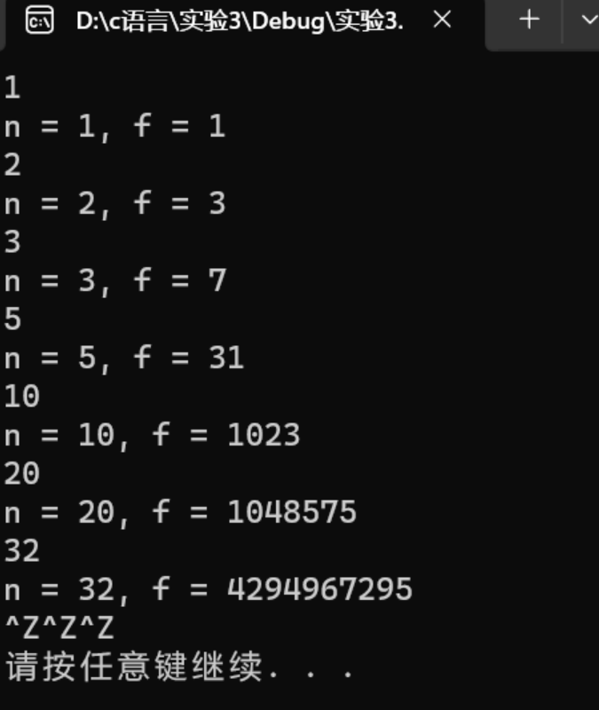 #include <stdio.h> 2 #include <stdlib.h> 3 long long func(int n); // 函数声明 4 5 int main() { 6 int n; 7 long long f; 8 9 while (scanf("%d", &n) != EOF) { 10 f = func(n); // 函数调用 11 printf("n = %d, f = %lld\n", n, f); 12 } 13 system("pause"); 14 return 0; 15 } 16 17 // 函数定义 18 long long func(int n){ 19 long long m; 20 if(n>=2){ 21 m=(func(n-1)+1)*2-1; 22 } 23 else 24 m=1; 25 26 return m;}