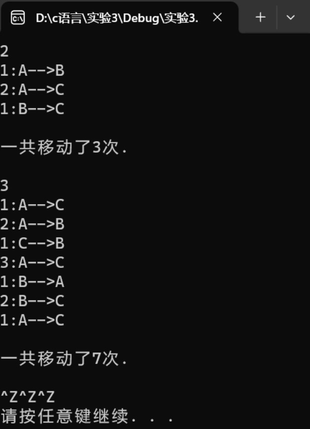 1 #include <stdio.h> 2 #include <stdlib.h> 3 void hanoi(unsigned int n,char from,char temp,char to);//函数声明 4 void moveplate(unsigned int n,char from,char to);//移动函数声明 5 6 int i=0; 7 int main(){ 8 unsigned int n; 9 while(scanf("%u",&n)!= EOF){ 10 hanoi(n,'A','B','C'); 11 printf("\n"); 12 printf("一共移动了%d次.\n",i); 13 printf("\n"); 14 i=0; 15 } 16 system("pause"); 17 return 0; 18 } 19 void hanoi(unsigned int n,char from,char temp,char to) 20 { 21 if(n==1) 22 moveplate(n,from,to); 23 else{ 24 hanoi(n-1,from,to,temp); 25 moveplate(n,from,to); 26 hanoi(n-1,temp,from,to); 27 } 28 } 29 30 void moveplate(unsigned int n,char from,char to) 31 { 32 printf("%u:%c-->%c\n",n,from,to); 33 ++i; 34 }