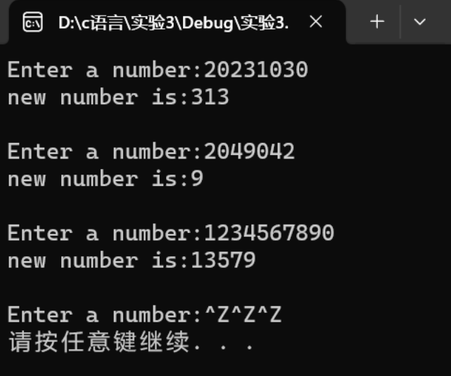 1 long func(long s);//函数声明 2 3 int main() 4 { 5 long s,t; 6 7 printf("Enter a number:"); 8 while (scanf("%ld",&s)!=EOF){ 9 t=func(s); 10 printf("new number is:%ld\n\n",t); 11 printf("Enter a number:"); 12 } 13 system("pause"); 14 return 0; 15 } 16 17 long func(long s) 18 { 19 int a,b; 20 int i=1,c=0; 21 do 22 { 23 a=s%10; 24 s=s/10; 25 b=a%2; 26 if(b!=0) 27 { 28 c=a*i+c; 29 i*=10; 30 } 31 }while(s>=1); 32 33 return c; 34 }