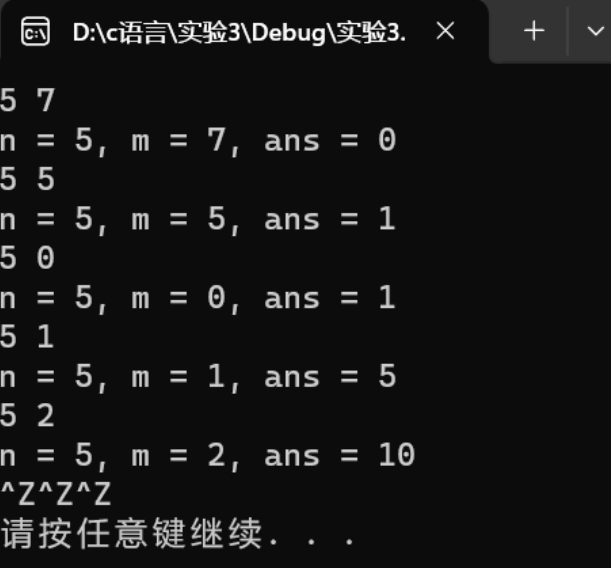 1 #include <stdio.h> 2 #include <stdlib.h> 3 int func(int n, int m); 4 5 int main() { 6 int n, m; 7 8 while(scanf("%d%d", &n, &m) != EOF) 9 printf("n = %d, m = %d, ans = %d\n", n, m, func(n, m)); 10 11 system("pause"); 12 return 0; 13 } 14 15 // 函数定义 16 int func(int n,int m){ 17 int i,s; 18 int a=1,b=1; 19 for(i=n;i>=(n-m+1);--i) 20 b=b*i; 21 for(i=1;i<=m;++i) 22 a=a*i; 23 s=b/a; 24 return s;}