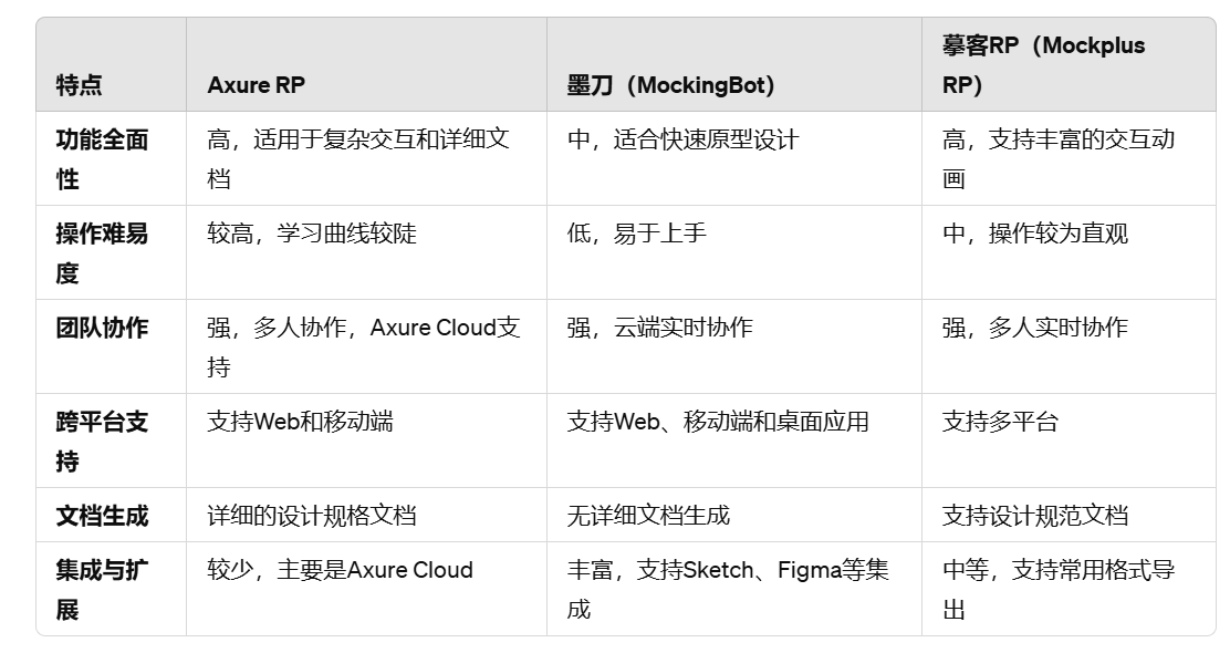 以下是三种主流的原型设计工具:Axure、墨刀和摹客RP的详细介绍及其特点和使用方法对比。