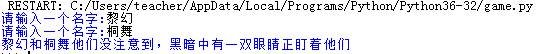 name1=input('请输入一个名字:') name2=input('请输入一个名字:') print('{}和{}他们没注意到,黑暗中有一双眼睛正盯着他们'.format(name1,name2))